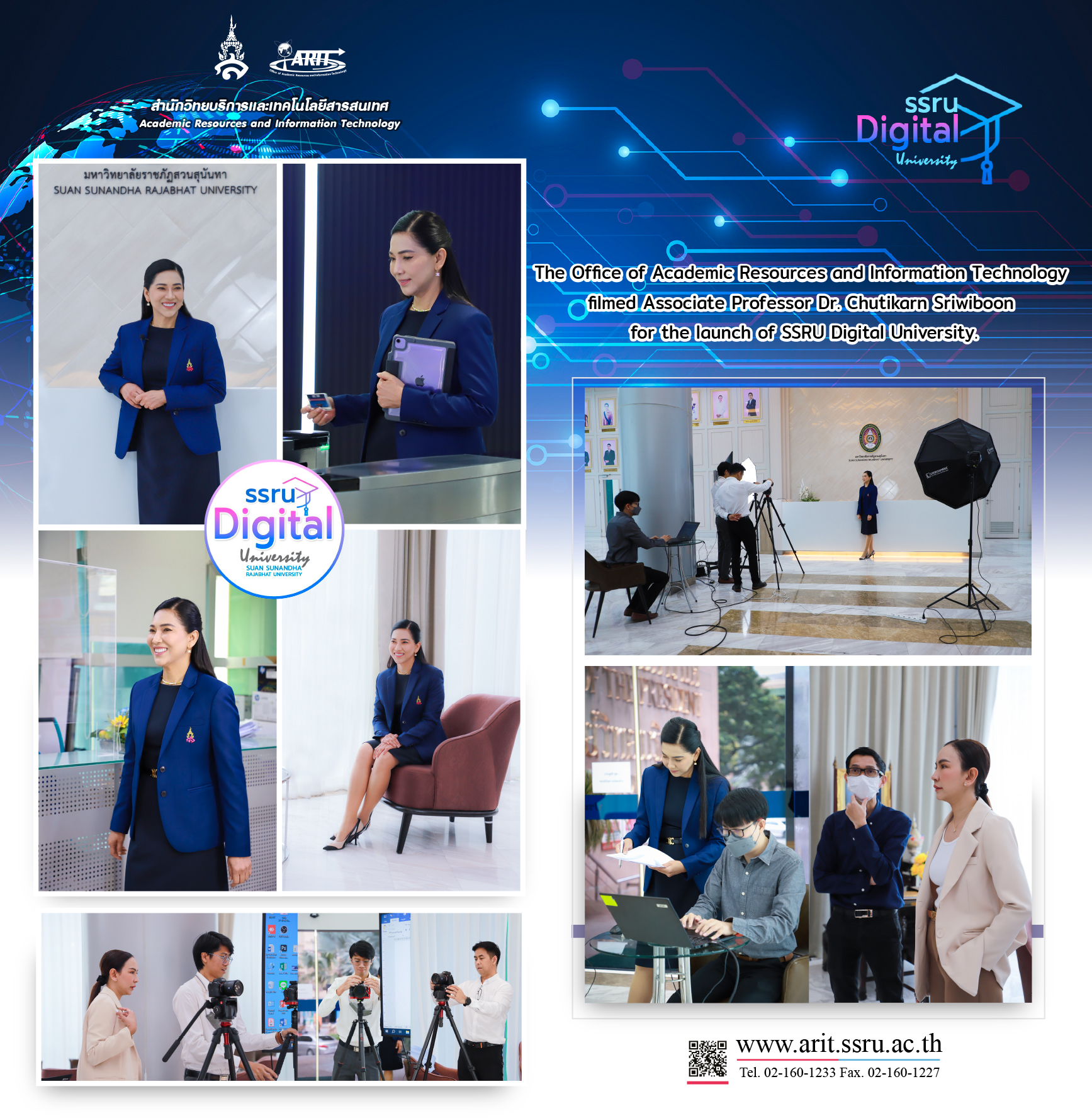 October 5, 2023. The Office of Academic Resources and Information Technology led by Assistant Professor Dr. Sirilak Ketchaya, Director, Ajarn Aphirak Thitinaruemit, Deputy Director of the Information Technology Center, and staff filmed Associate Professor Dr. Chutikarn Sriwiboon for the launch of SSRU Digital University at the President's Office hall and the Academic Resource Center.