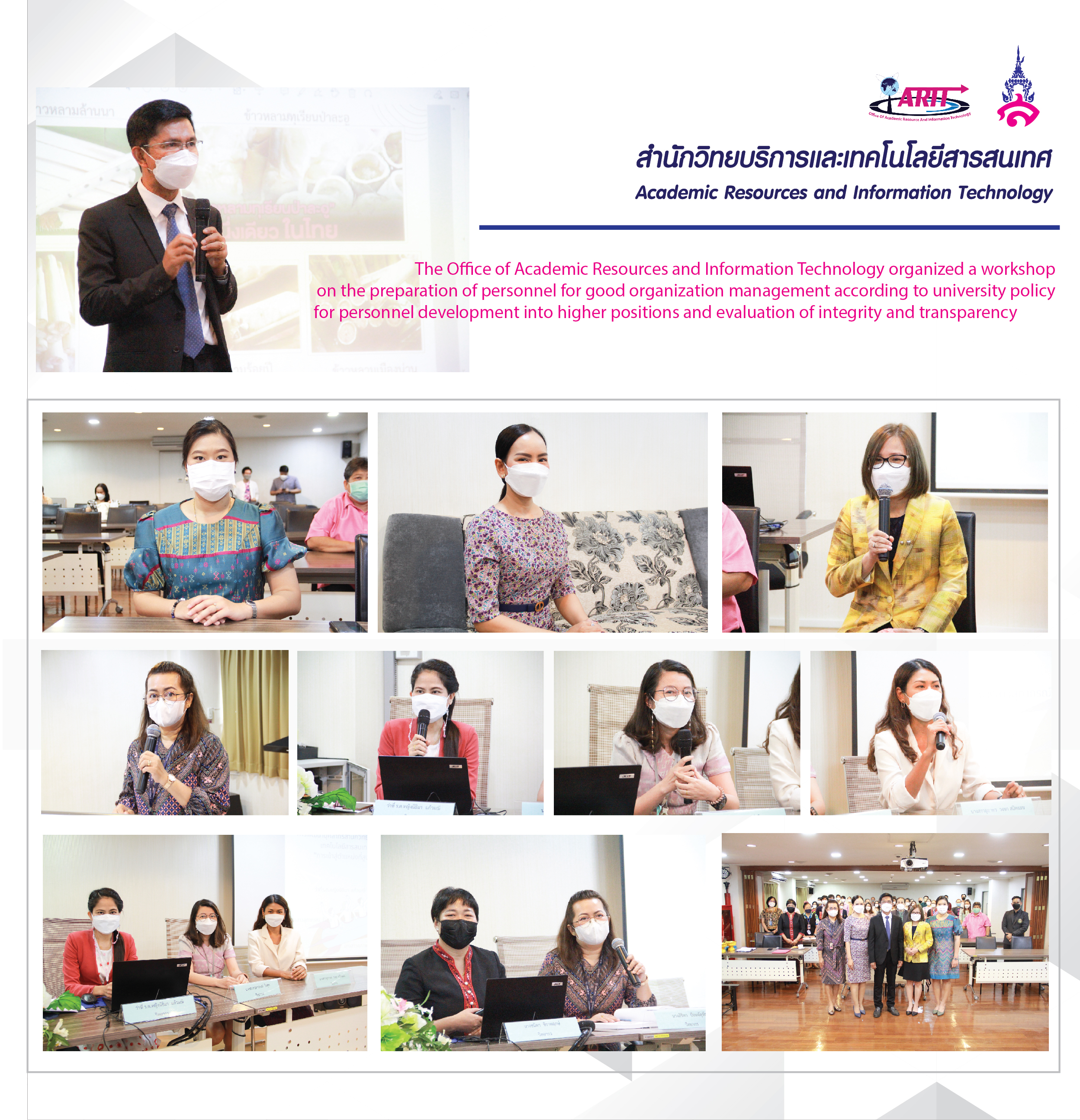19th April 2022. The Office of Academic Resources and Information Technology organized a workshop project on “Preparing personnel for good organization management according to the university policy for personnel development into higher positions and evaluation of integrity and transparency Fiscal Year 2022" led by Assistant Professor Dr. Sirilak Ketchaya, Director of the Office of Academic Resources and Information Technology, along with Ajarn Dr. Pimploi Tirastittam, Deputy Director of the Academic Resource Center, Assistant Professor Dr. Kanyapat Thanakulwuthirot, Deputy Director of Quality Assurance and Income and personnel join the lecture of “The preparation of personnel for good organization management according to the university policy for the development of personnel into higher positions” from Associate Professor Dr. Luedech Kerdwichai, President of Suan Sunandha Rajabhat University Council as a lecturer.
