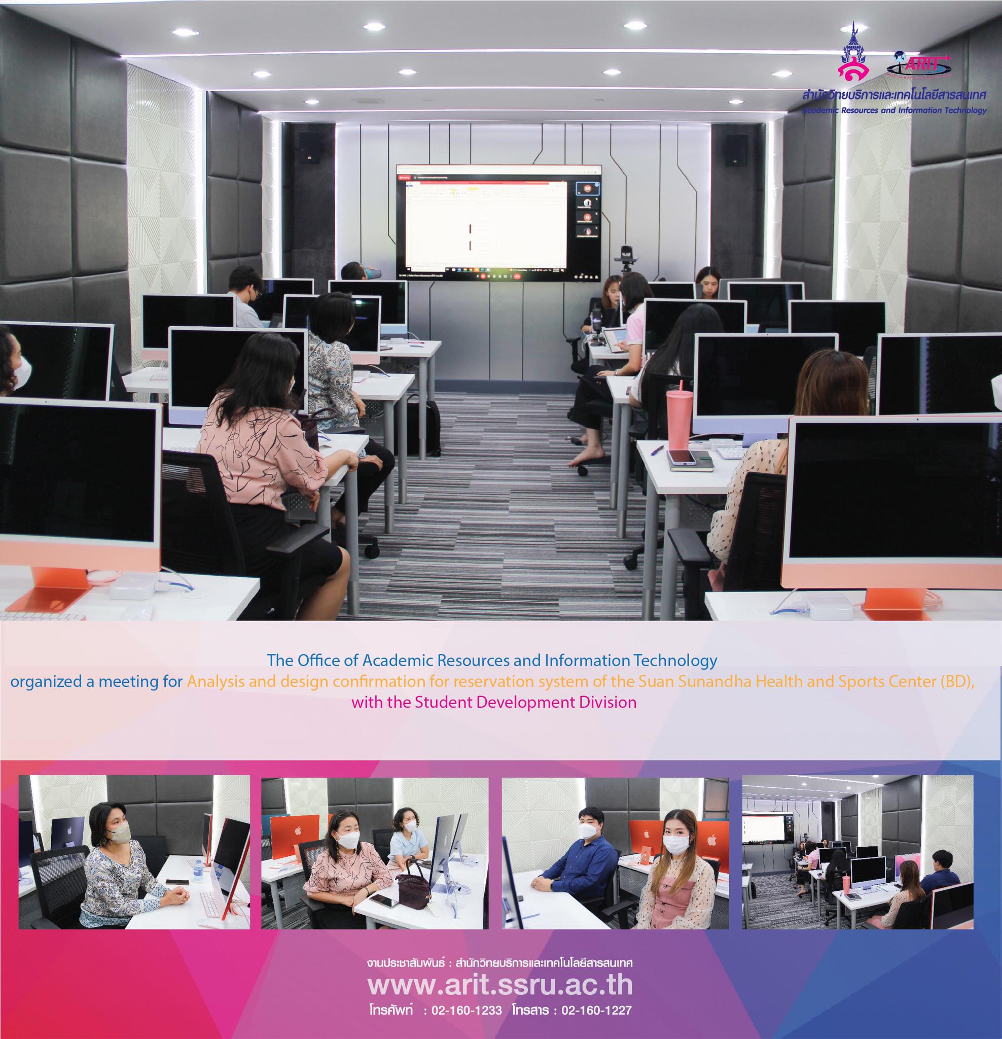 21th March 2023. The Office of Academic Resources and Information Technology by Assistant Professor Dr. Sirilak Ketchaya, Director, assigned Mr. Nat Ploy-ong and Ms. Waraporn Naraprasertwong, a Computer Technical Officer in the Information System Development Department organized a meeting on "Analysis and design confirmation for reservation system of the Suan Sunandha Health and Sports Center (BD), the Student Development Division" as part of the project to develop the organizational management information system to support becoming a digital university, at the meeting room of Imac Lab.