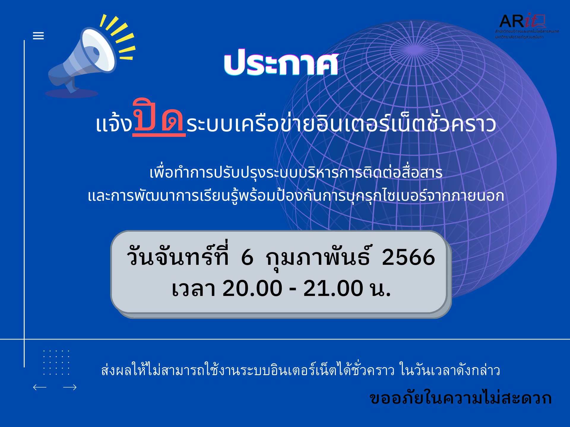 สำนักวิทยบริการและเทคโนโลยีสารสมเทศ ขอประกาศแจ้งปิดระบบเครือข่ายอินเตอร์เน็ตชั่วคราว