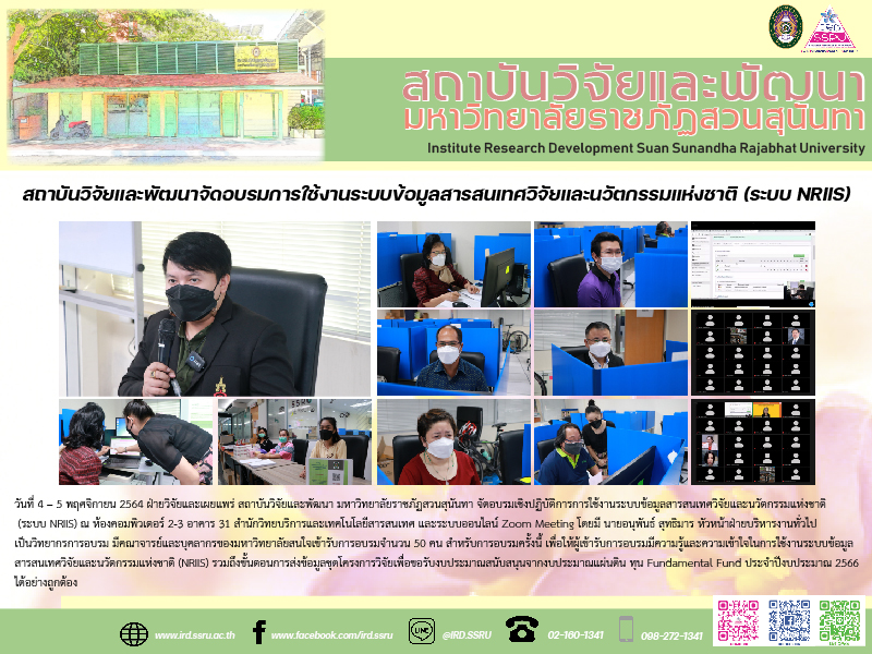 วันที่ 4 – 5 พฤศจิกายน 2564 ฝ่ายวิจัยและเผยแพร่ สถาบันวิจัยและพัฒนา มหาวิทยาลัยราชภัฏสวนสุนันทา จัดอบรมเชิงปฏิบัติการการใช้งานระบบข้อมูลสารสนเทศวิจัยและนวัตกรรมแห่งชาติ (ระบบ NRIIS) ณ ห้องคอมพิวเตอร์ 2-3 อาคาร 31 สำนักวิทยบริการและเทคโนโลยีสารสนเทศ และระบบออนไลน์ Zoom Meeting โดยมี นายอนุพันธ์ สุทธิมาร หัวหน้าฝ่ายบริหารงานทั่วไป เป็นวิทยากรการอบรม มีคณาจารย์และบุคลากรของมหาวิทยาลัยสนใจเข้ารับการอบรมจำนวน 50 คน สำหรับการอบรมครั้งนี้ เพื่อให้ผู้เข้ารับการอบรมมีความรู้และความเข้าใจในการใช้งานระบบข้อมูลสารสนเทศวิจัยและนวัตกรรมแห่งชาติ (NRIIS) รวมถึงขั้นตอนการส่งข้อมูลชุดโครงการวิจัยเพื่อขอรับงบประมาณสนับสนุนจากงบประมาณแผ่นดิน ทุน Fundamental Fund ประจำปีงบประมาณ 2566 ได้อย่างถูกต้อง