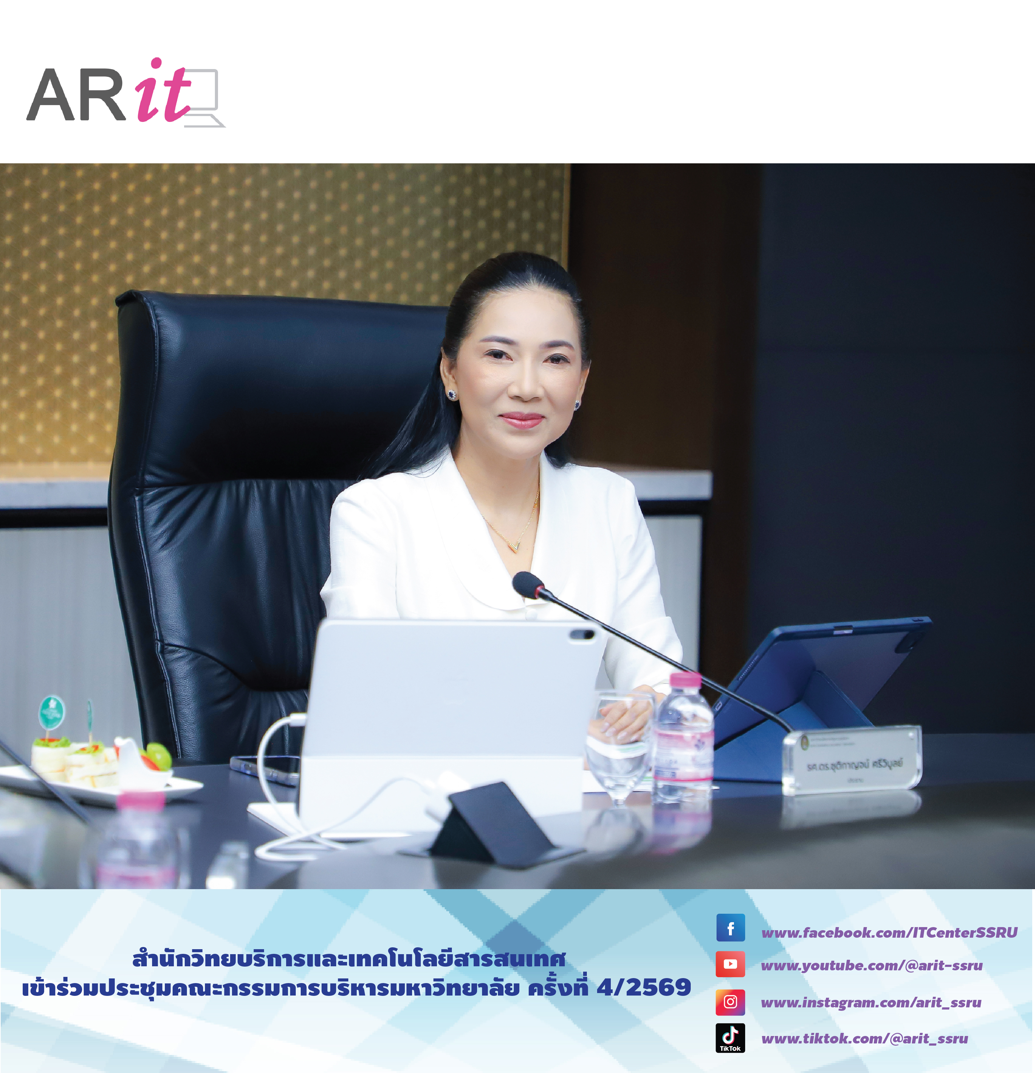 วันที่ 7 เมษายน 2569 สำนักวิทยบริการและเทคโนโลยีสารสนเทศ นำโดย รองศาสตราจารย์ ดร. ศิริลักษณ์ เกตุฉาย รองอธิการบดีฝ่ายเทคโนโลยีดิจิทัล พร้อมด้วย อาจารย์ ดร.พิมพ์พลอย ธีรสถิตย์ธรรม ผู้อำนวยการสำนักวิทยบริการและเทคโนโลยีสารสนเทศ นางสิริพร ป้อมจัตุรัส หัวหน้าสำนักงานฯ เข้าร่วมประชุมคณะกรรมการบริหารมหาวิทยาลัย ครั้งที่ 4/2569 โดยมี รองศาสตราจารย์ ดร.ชุติกาญจน์ ศรีวิบูลย์ อธิการบดี เป็นประธานการประชุม พร้อมด้วย รองอธิการบดี และผู้บริหารของมหาวิทยาลัย ณ ห้องประชุมสภามหาวิทยาลัย อาคาร 31 ชั้น 5
