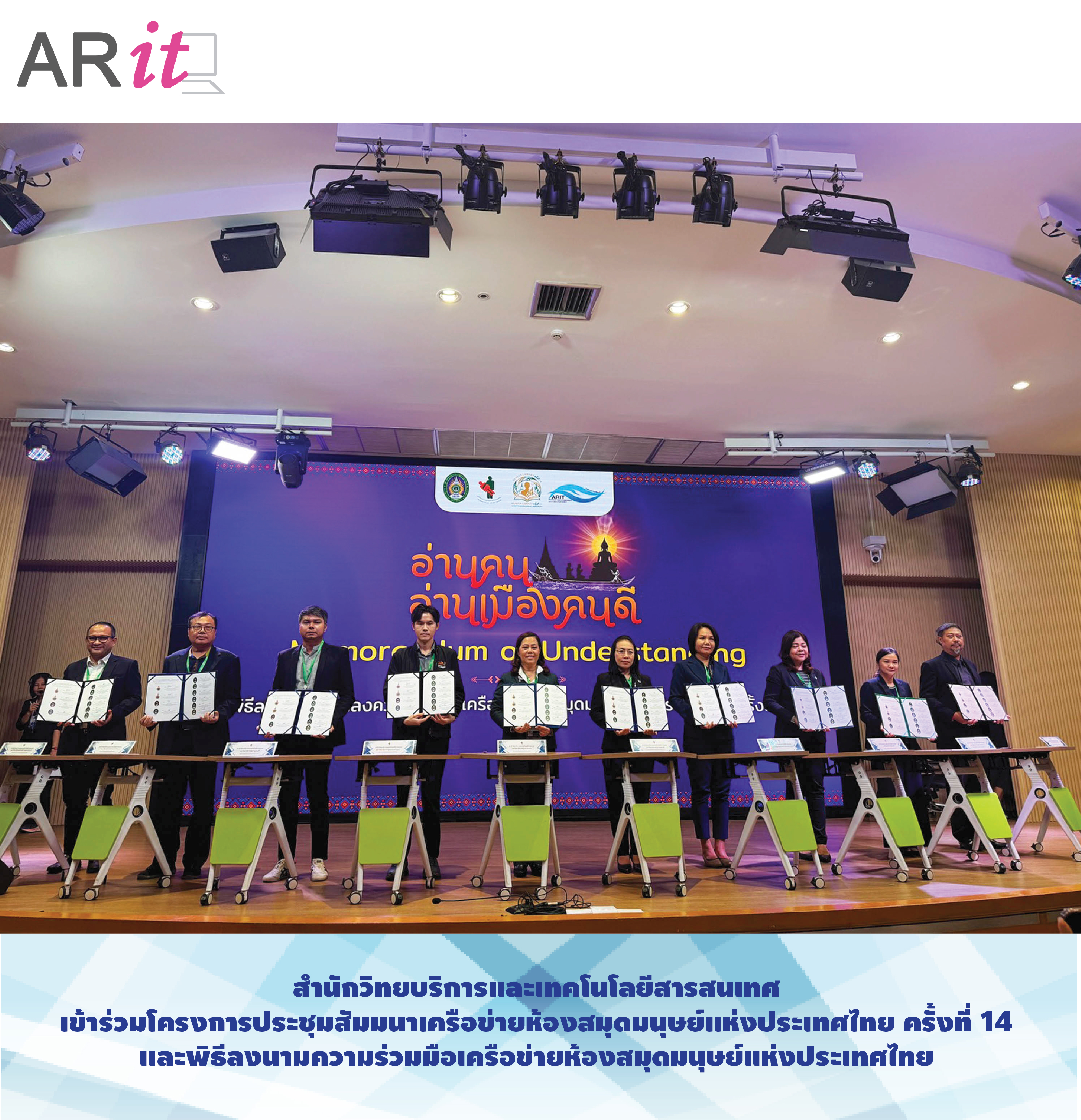 วันที่ 5 มีนาคม 2569 สำนักวิทยบริการและเทคโนโลยีสารสนเทศ นำโดย อาจารย์ ดร.พิมพ์พลอย ธีรสถิตย์ธรรม ผู้อำนวยการสำนักวิทยบริการและเทคโนโลยีสารสนเทศ พร้อมด้วย อาจารย์เบญญา หวังมหาพร รองผู้อำนวยการศูนย์วิทยบริการ เข้าร่วม โครงการประชุมสัมมนาเครือข่ายห้องสมุดมนุษย์แห่งประเทศไทย ครั้งที่ 14 และร่วมพิธี ลงนามความร่วมมือเครือข่ายห้องสมุดมนุษย์แห่งประเทศไทย เพื่อเสริมสร้างความร่วมมือทางวิชาการและการพัฒนาระบบการเรียนรู้ผ่านแนวคิดห้องสมุดมนุษย์ (Human Library)