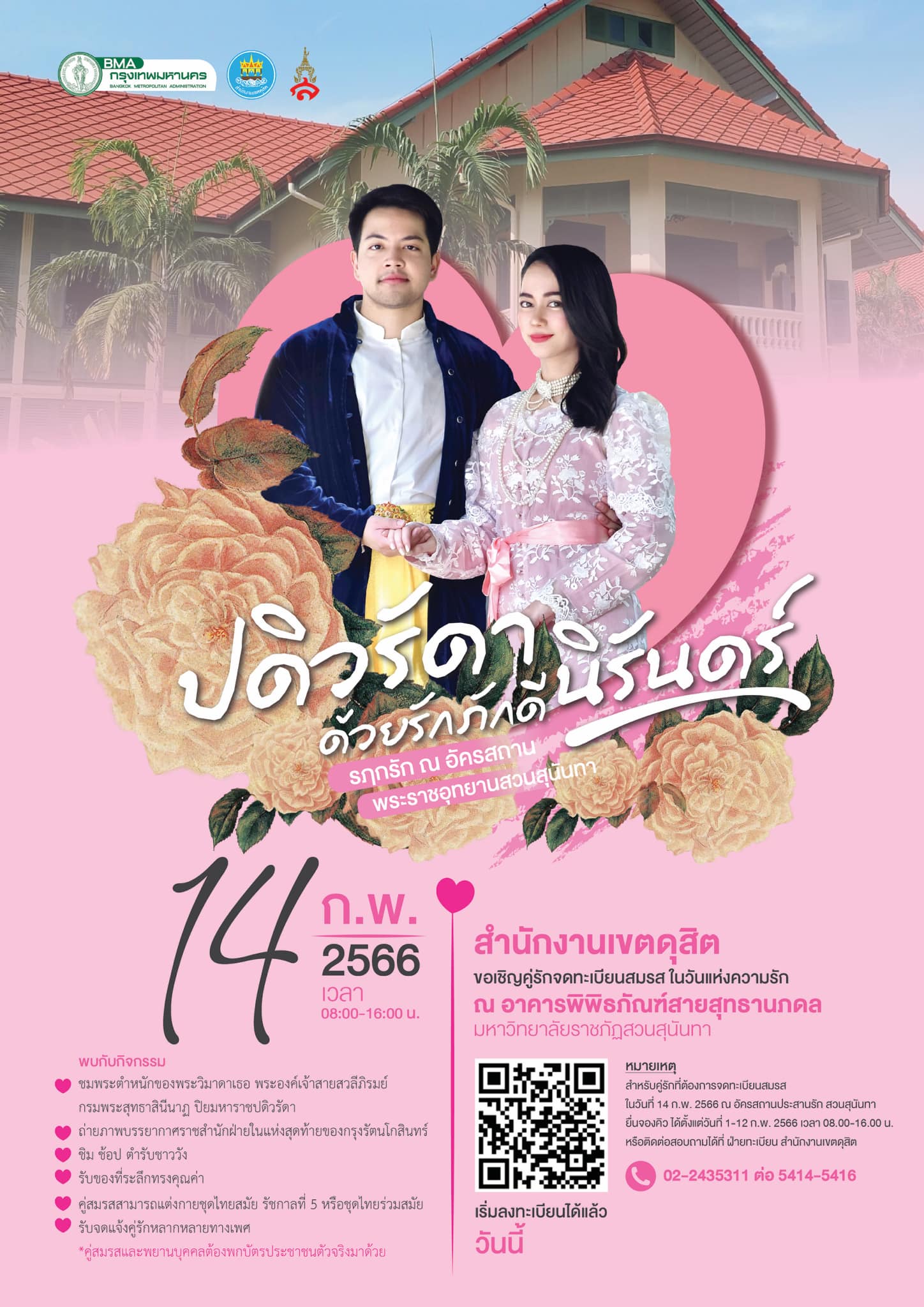 สวนสุนันทา ร่วมกับสำนักงานเขตดุสิต ขอเชิญชวนคู่รัก #จดทะเบียนสมรส ในวันที่ 14 กุมภาพันธ์ #วันแห่งความรัก ณ พิพิธภัณฑ์อาคารสายสุทธานภดล มหาวิทยาลัยราชภัฏสวนสุนันทา