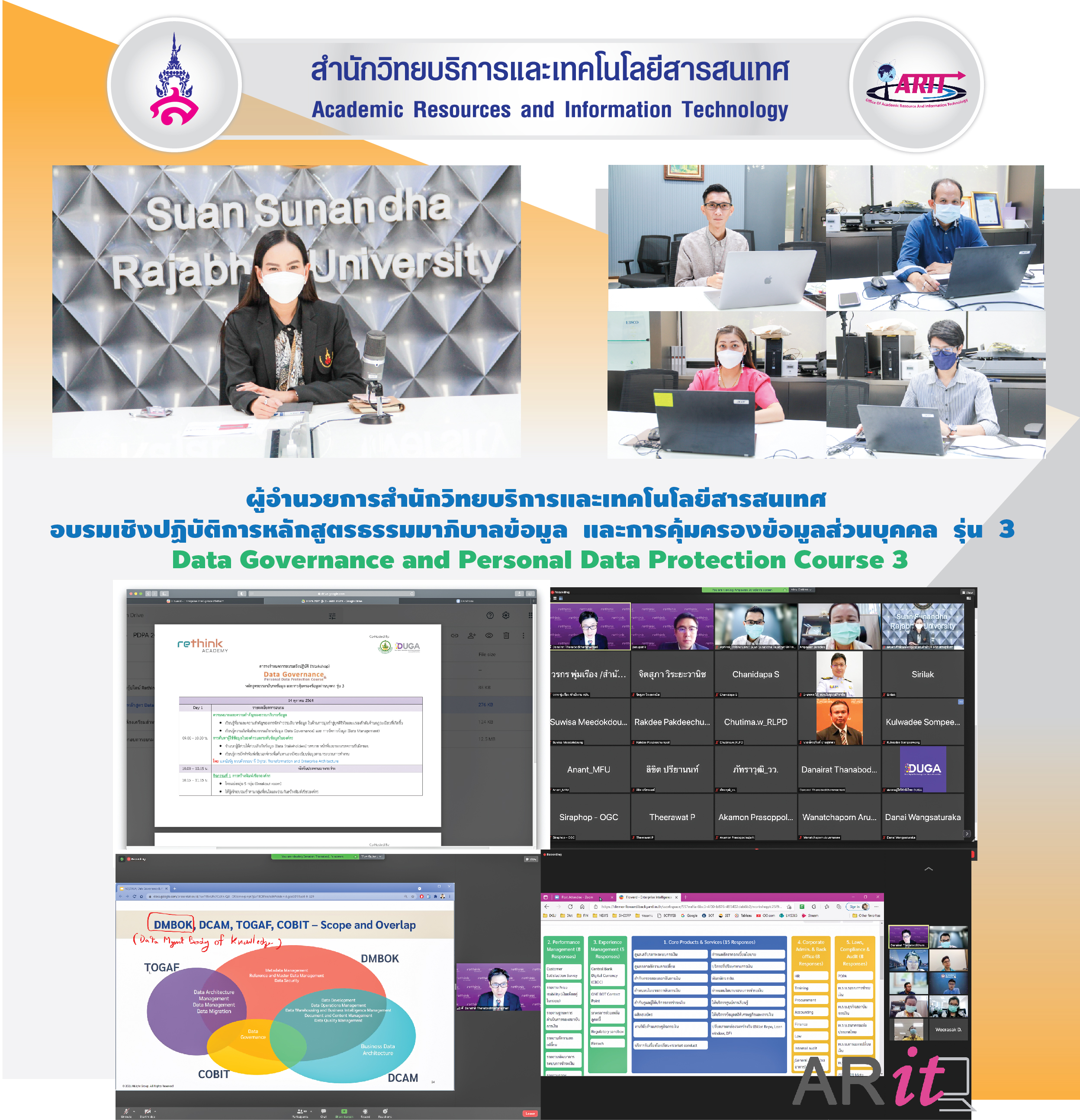 วันที่ 14 ตุลาคม 2564 ผู้ช่วยศาสตราจารย์ ดร.ศิริลักษณ์ เกตุฉาย ผู้อำนวยการสำนักวิทยบริการและเทคโนโลยีสารสนเทศ พร้อมด้วย อาจารย์อภิรักษ์ ธิตินฤมิต รองผู้อำนวยการศูนย์เทคโนโลยีสารสนเทศ นายอโณทัย อรุณเรือง หัวหน้าฝ่ายระบบเครือข่ายและอินเทอร์เน็ต และนักวิชาการคอมพิวเตอร์ ร่วมอบรมเชิงปฏิบัติการหลักสูตรธรรมมาภิบาลข้อมูลและการคุ้มครองข้อมูลส่วนบุคคล รุ่น 3 (Data Governance and Personal Data Protection Course 3) ซึ่งจัดขึ้นโดยกระทรวงดิจิทัลเพื่อเศรษฐกิจและสังคมและสมาคมผู้ใช้ดิจิทัลไทย ระหว่างวันที่ 14- 15 ตุลาคม 2564 ผ่าน zoom meeting