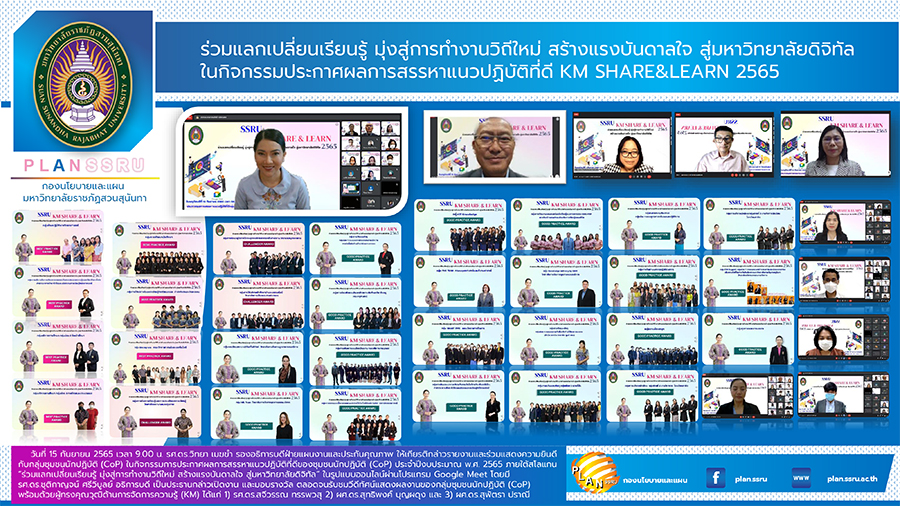 วันที่ 15 กันยายน 2565 เวลา 9.00 น. รศ.ดร.วิทยา เมฆขำ รองอธิการบดีฝ่ายแผนงานและประกันคุณภาพ ให้เกียรติกล่าวรายงานและร่วมแสดงความยินดีกับกลุ่มชุมชนนักปฏิบัติ (CoP) ในกิจกรรมการประกาศผลการสรรหาแนวปฏิบัติที่ดีของชุมชนนักปฏิบัติ (CoP) ประจำปีงบประมาณ พ.ศ. 2565 ภายใต้สโลแกน "ร่วมแลกเปลี่ยนเรียนรู้ มุ่งสู่การทำงานวิถีใหม่ สร้างแรงบันดาลใจ สู่มหาวิทยาลัยดิจิทัล" ในรูปแบบออนไลน์ผ่านโปรแกรม Google Meet โดยมี รศ.ดร.ชุติกาญจน์ ศรีวิบูลย์ อธิการบดี เป็นประธานกล่าวเปิดงาน และมอบรางวัล ตลอดจนรับชมวีดีทัศน์แสดงผลงานของกลุ่มชุมชนนักปฏิบัติ (CoP) พร้อมด้วยผู้ทรงคุณวุฒิด้านการจัดการความรู้ (KM) ได้แก่ 1) รศ.ดร.สจีวรรณ ทรรพวสุ 2) ผศ.ดร.สุทธิพงศ์ บุญผดุง และ 3) ผศ.ดร.สุพัตรา ปราณี