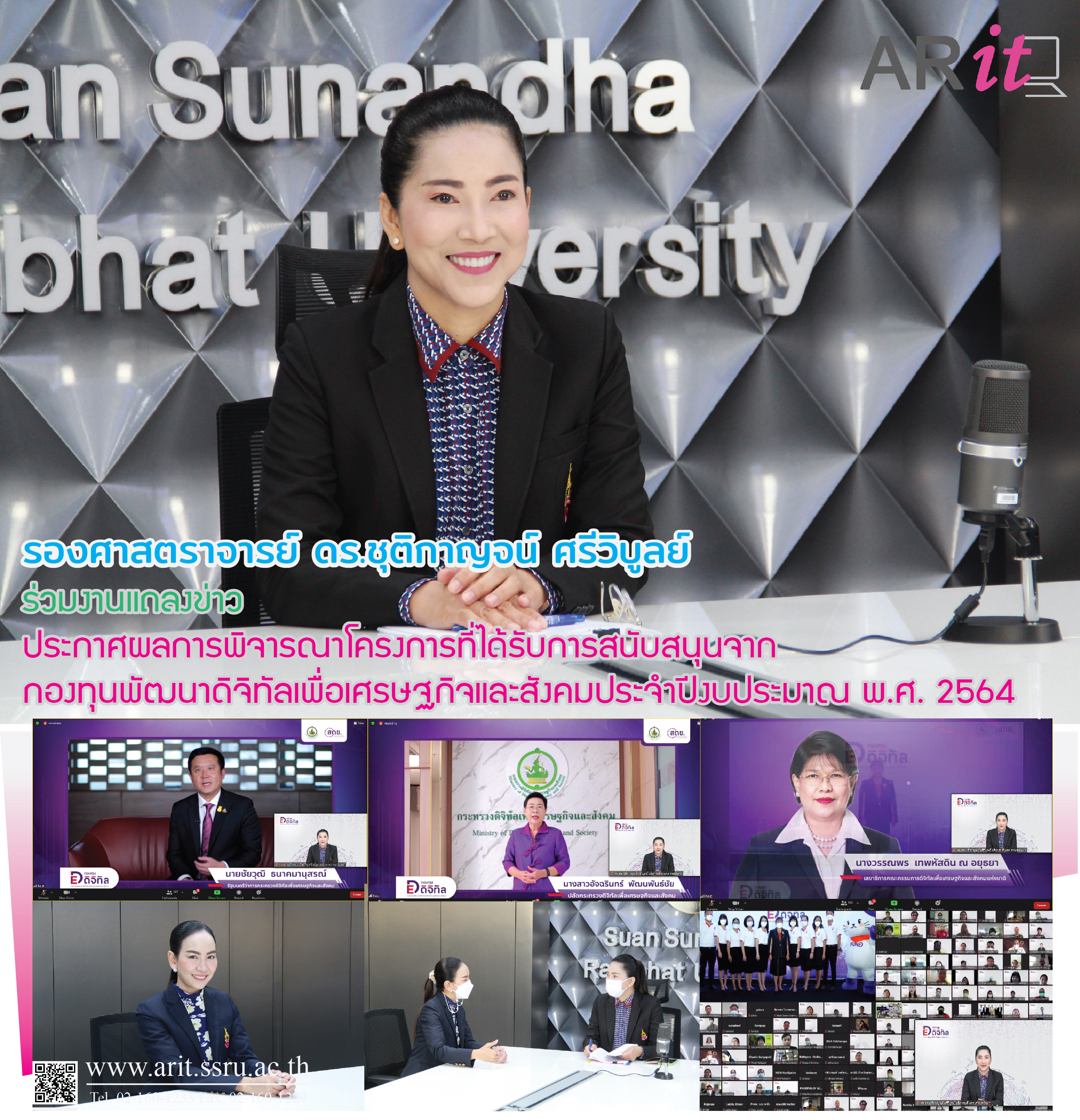 วันที่ 27 กันยายน 2564 รองศาสตราจารย์ ดร.ชุติกาญจน์ ศรีวิบูลย์ อธิการบดี พร้อมด้วย ผู้ช่วยศาสตราจารย์ ดร.ศิริลักษณ์ เกตุฉาย ผู้อำนวยการสำนักวิทยบริการและเทคโนโลยีสารสนเทศ ร่วมงานแถลงข่าว "ประกาศผลการพิจารณาโครงการที่ได้รับการสนับสนุนจากกองทุนพัฒนาดิจิทัลเพื่อเศรษฐกิจและสังคมประจำปีงบประมาณ พ.ศ. 2564" โดยทางสำนักวิทยบริการและเทคโนโลยีสารสนเทศ ได้รับทุนสนับสนุนจากสำนักงานคณะกรรมการดิจิทัลเพื่อเศรษฐกิจและสังคมแห่งชาติในครั้งนี้ด้วย ในชื่อ “โครงการต้นแบบระบบการอบรมกลุ่มหลักสูตรทักษะขั้นสูงเฉพาะทาง เพื่อพัฒนาศักยภาพบุคลากรดิจิทัลทางการศึกษาในบริบทประเทศไทย” โดยมี นายชัยวุฒิ ธนาคมานุสรณ์ รัฐมนตรีว่าการกระทรวงดิจิทัลเพื่อเศรษฐกิจและสังคม เป็นผู้ร่วมกล่าวแสดงความยินดีแก่ผู้ได้รับทุนผ่านระบบ Zoom Meeting