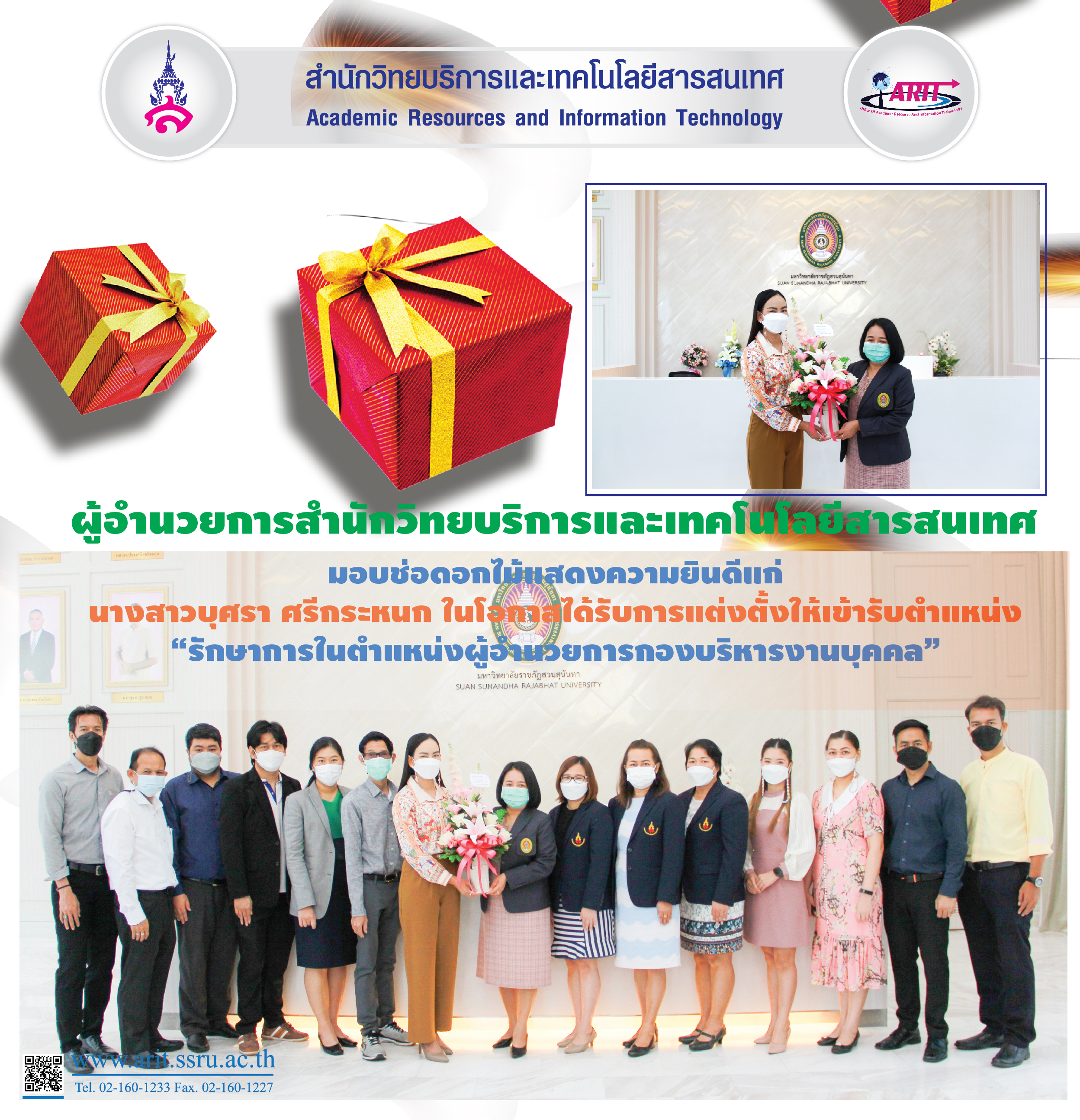 ผู้อำนวยการสำนักวิทยบริการและเทคโนโลยีสารสนเทศ มอบช่อดอกไม้แสดงความยินดีแก่ นางสาวบุศรา ศรีกระหนก ในโอกาสได้รับการแต่งตั้งให้เข้ารับตำแหน่ง “รักษาการในตำแหน่งผู้อำนวยการกองบริหารงานบุคคล”