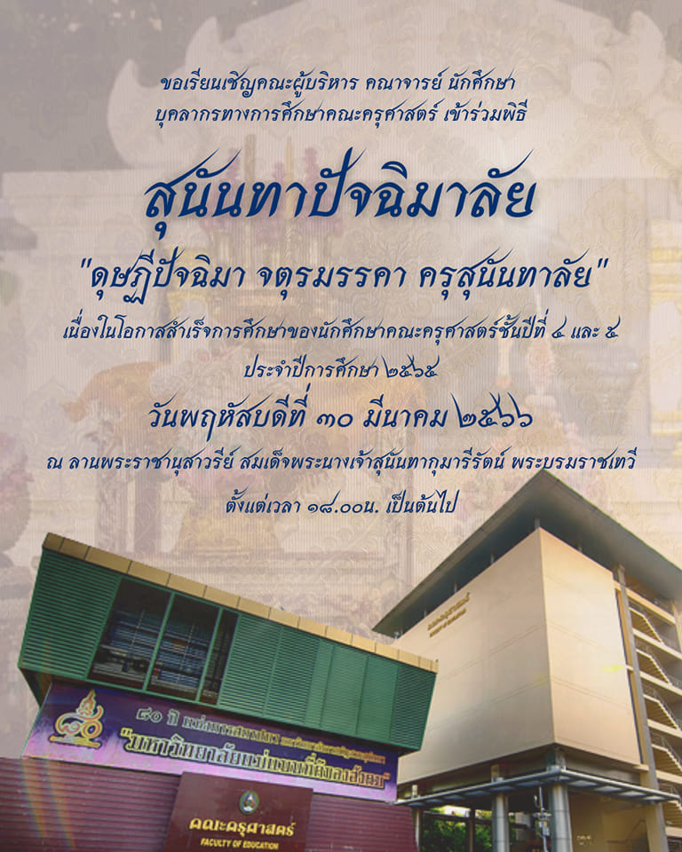 ขอเรียนเชิญคณะผู้บริหาร คณาจารย์ นักศึกษา บุคลากรทางการศึกษาคณะครุศาสตร์ เข้าร่วมพิธีสุนันทาปัจฉิมาลัย
