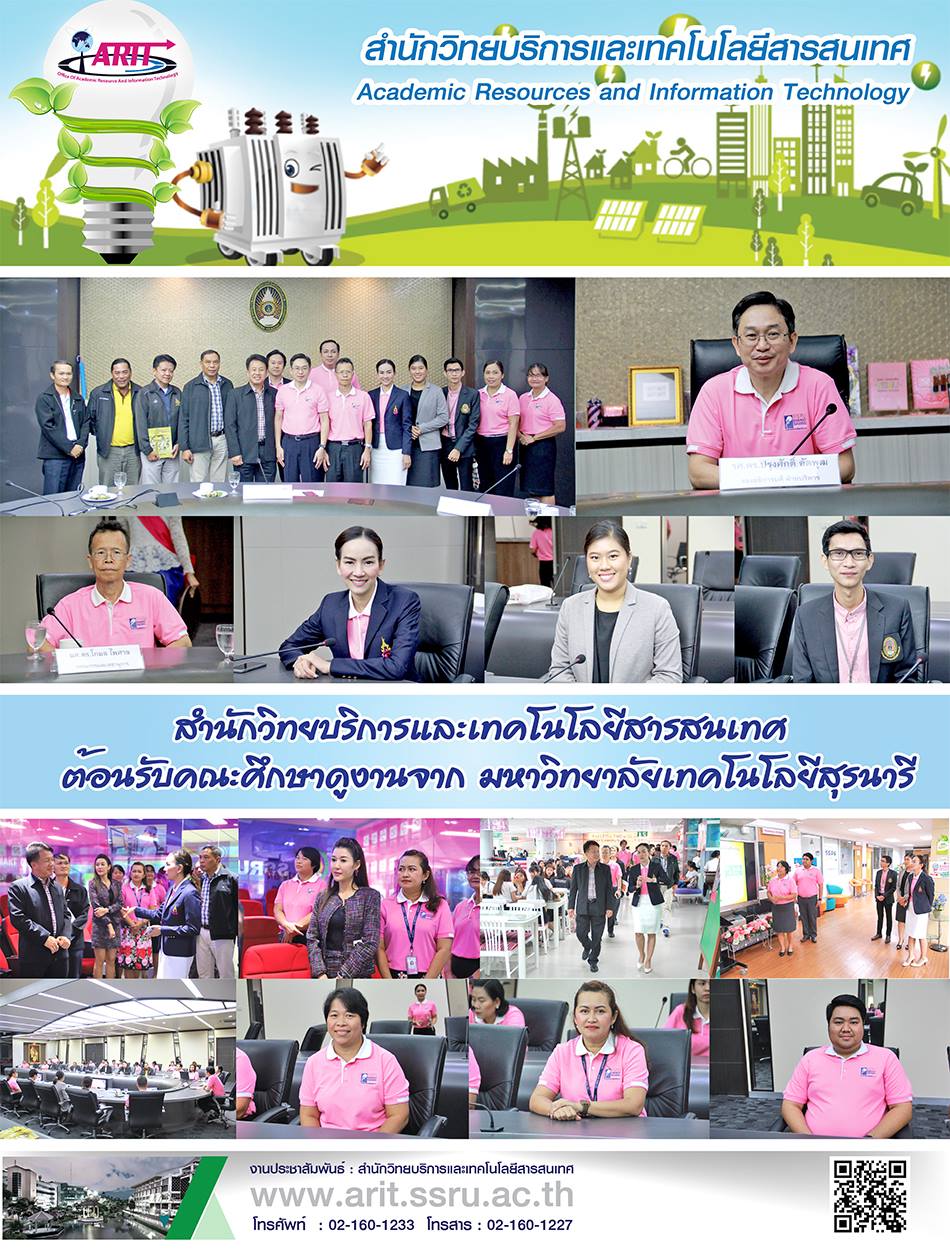 วันที่ 21 สิงหาคม 2561 รองศาสตราจารย์ ดร.ปรุงศักดิ์ อัตพุฒ รองอธิการบดีฝ่ายบริหาร เป็นประธานกล่าวต้อนรับ คณะศึกษาดูงานจาก มหาวิทยาลัยเทคโนโลยีสุรนารี ร่วมด้วย ผู้ช่วยศาสตราจารย์ ดร.โกมล ไพศาล ผู้อำนวยการสำนักงานอธิการบดี ผู้ช่วยศาสตราจารย์ ดร.ศิริลักษณ์ เกตุฉาย ผู้อำนวยการสำนักวิทยบริการและเทคโนโลยีสารสนเทศ อาจารย์อภิรักษ์ ธิตินฤมิต รองผู้อำนวยการศูนย์เทคโนโลยีสารสนเทศ อาจารย์กันยพัชร์ ธนกุลวุฒิโรจน์ รองผู้อำนวยการฝ่ายประกันคุณภาพและรายได้