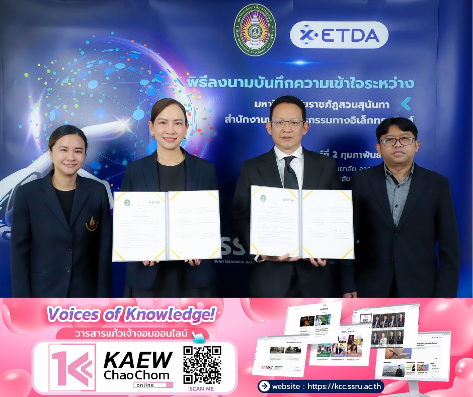 วันที่ 2 กุมภาพันธ์ 2569 มหาวิทยาลัยราชภัฏสวนสุนันทา จัดพิธีลงนามบันทึกความเข้าใจ (MOU) ร่วมกับสำนักงานพัฒนาธุรกรรมทางอิเล็กทรอนิกส์ (ETDA) ณ ห้องประชุมสภามหาวิทยาลัย อาคาร 31 ชั้น 5 เพื่อขับเคลื่อนความร่วมมือด้านวิชาการ งานวิจัย และการพัฒนาศักยภาพบุคลากรและนักศึกษา ในมิติเทคโนโลยีดิจิทัลและธุรกรรมทางอิเล็กทรอนิกส์อย่างเป็นระบบ
