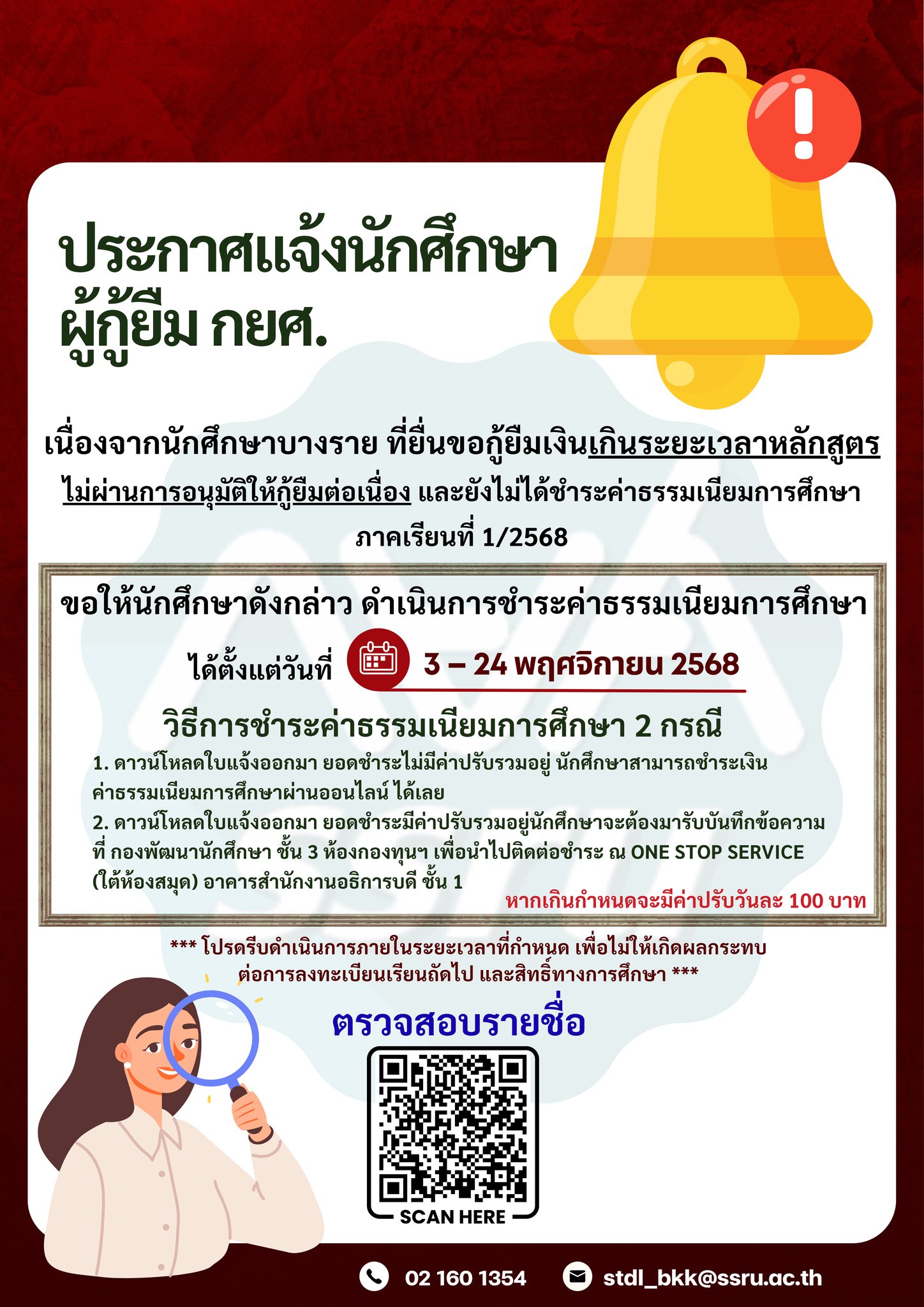 ไม่ผ่านการอนุมัติให้กู้ยืมต่อเนื่อง และยังไม่ได้ชำระค่าธรรมเนียมการศึกษา ภาคเรียนที่ 1/2568