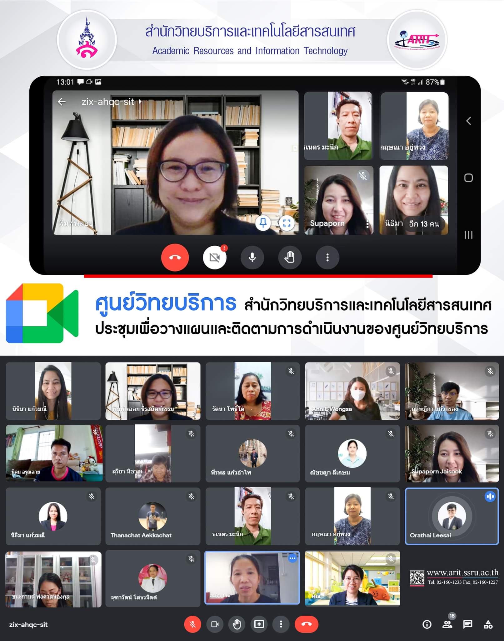วันที่ 14 กรกฎาคม 2564 ศูนย์วิทยบริการ สำนักวิทยบริการและเทคโนโลยีสารสนเทศ จัด ประชุมเพื่อวางแผน และติดตามการดำเนินงานของศูนย์วิทยบริการ นำโดย อาจารย์ ดร.พิมพ์พลอย ธีรสถิตย์ธรรม รองผู้อำนวยการศูนย์วิทยบริการ ในช่วงของการปฏิบัติงาน Work From Home โดยเป็นการประชุมในรูปแบบออนไลน์ ผ่านระบบ google meet
