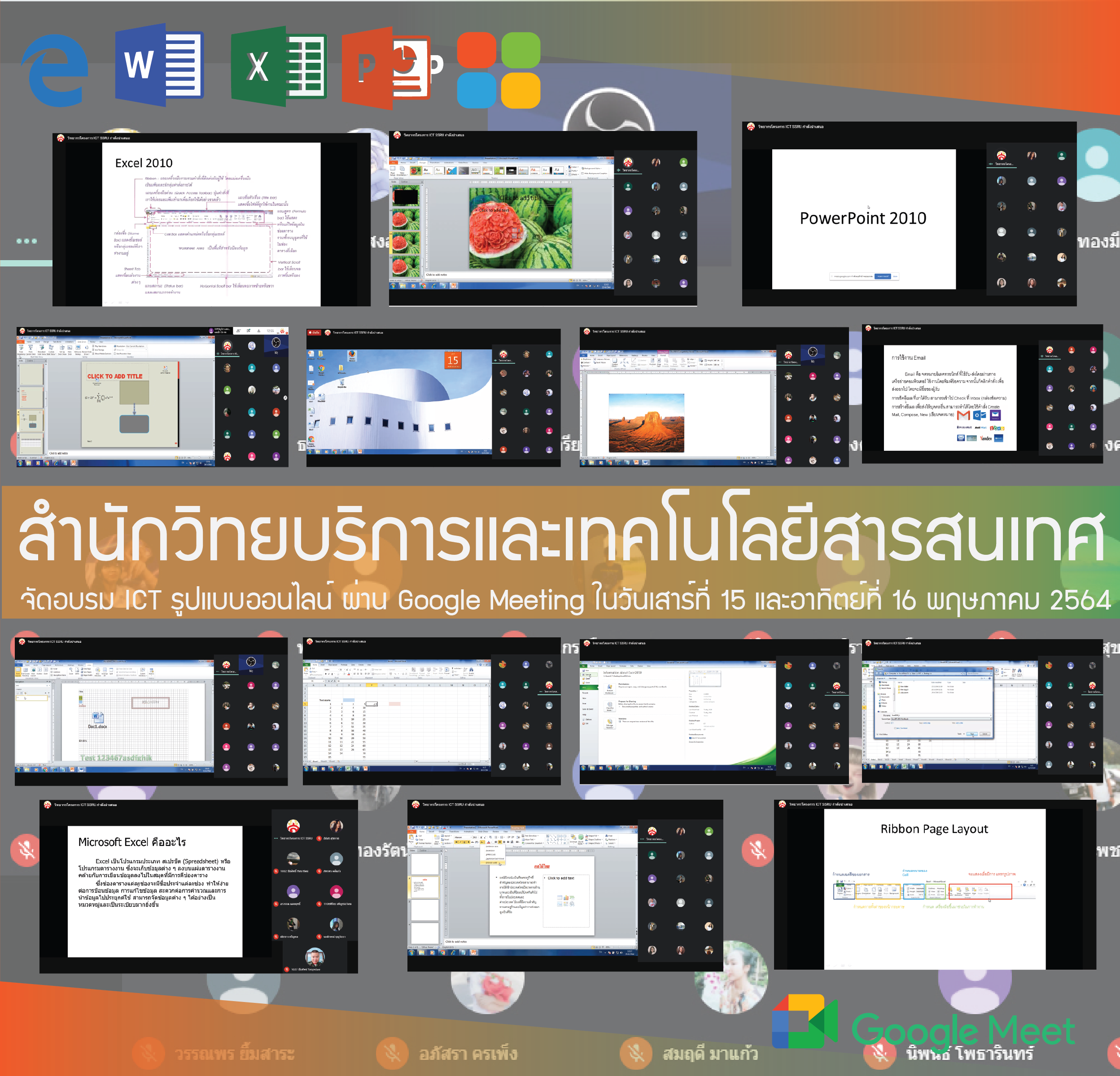 สำนักวิทยบริการและเทคโนโลยีสารสนเทศ โดย ผู้ช่วยศาสตราจารย์ ดร. ศิริลักษณ์ เกตุฉาย ผู้อำนวยการสำนักวิทยบริการและเทคโนโลยีสารสนเทศ จัดอบรมโครงการ ICT ในรูปแบบออนไลน์ ผ่าน Google Meeting ให้กับนักศึกษาระดับปริญญาตรีทุกชั้นปี โดยมอบหมายให้ นางสาวนุชจรี เกตุสุวรรณ์ หัวหน้าฝ่ายบริหารงานทั่วไป และ นายรุจิโรจน์ กังเจริญสัมพันธ์ นักวิชาการคอมพิวเตอร์ เป็นผู้จัดโครงการ โดยมีวัตถุประสงค์เพื่อพัฒนาทักษะมาตรฐานการใช้เทคโนโลยีสารสนเทศและการสื่อสารให้กับนักศึกษา รวมไปถึงสามารถนำความรู้และทักษะทางด้านเทคโนโลยีสารสนเทศไปใช้ในการศึกษาได้อย่างมีประสิทธิภาพ โดยโครงการดังกล่าวจัดขึ้นระหว่าง วันที่ 15 - 16 พฤษภาคม 2564