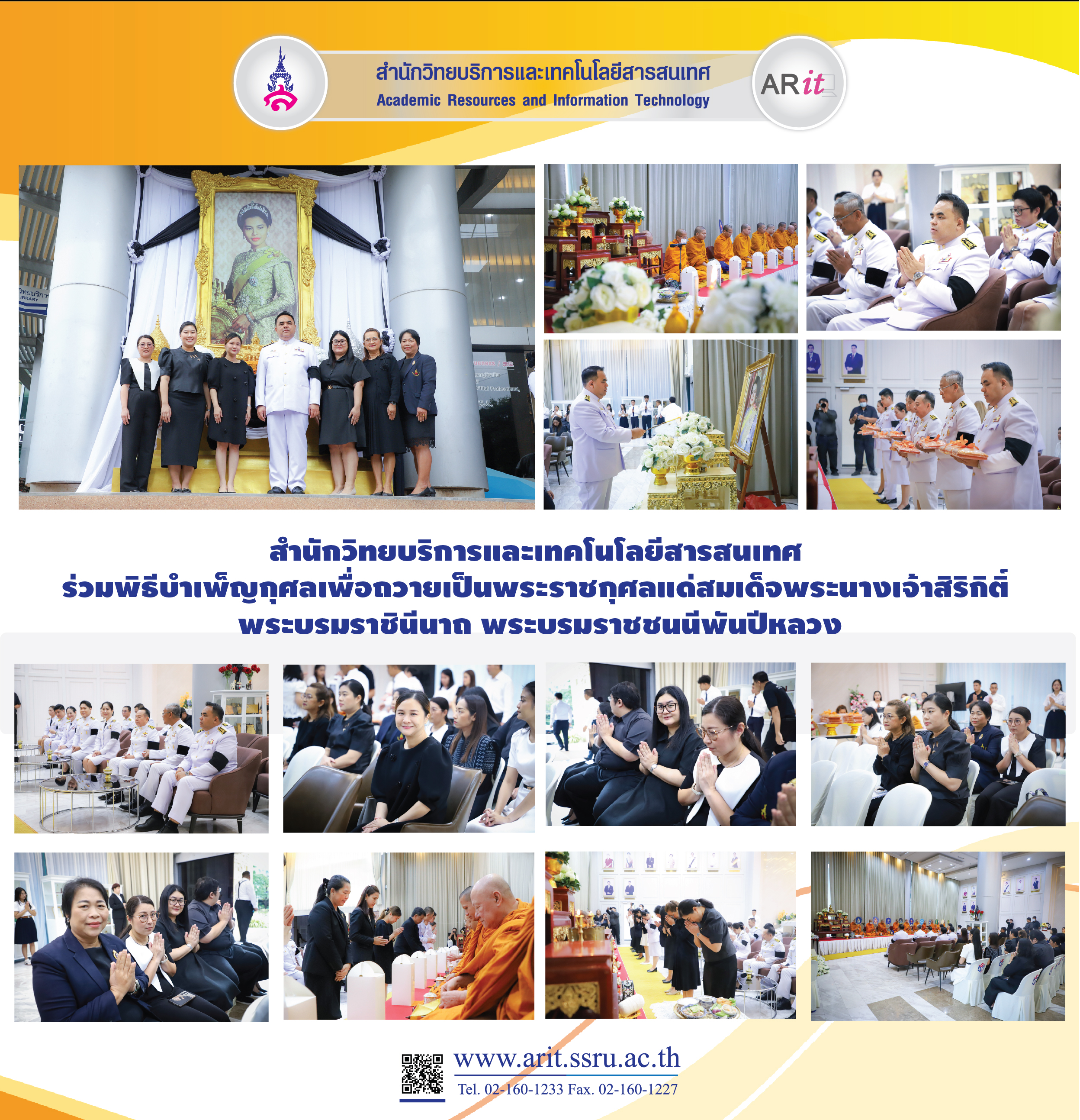 วันที่ 12 ธันวาคม 2568 สำนักวิทยบริการและเทคโนโลยีสารสนเทศ นำโดย อาจารย์ ดร.พิมพ์พลอย ธีรสถิตย์ธรรม ผู้อำนวยการสำนักวิทยบริการและเทคโนโลยีสารสนเทศ พร้อมด้วย อาจารย์เบญญา หวังมหาพร รองผู้อำนวยการศูนย์วิทยบริการ ผู้ช่วยศาสตราจารย์ ดร.กันยพัชร์ ธนกุลวุฒิโรจน์ รองผู้อำนวยการฝ่ายประกันคุณภาพและรายได้ และบุคลากรของสำนักฯ ร่วมพิธีบำเพ็ญกุศลเพื่อถวายเป็นพระราชกุศลแด่สมเด็จพระนางเจ้าสิริกิติ์ พระบรมราชินีนาถ พระบรมราชชนนีพันปีหลวง ครบ 50 วัน แห่งการสวรรคตโดยมี รองศาสตราจารย์ ดร.คมสัน โสมณวัตร รองอธิการบดีฝ่ายบริหาร เป็นประธาน พร้อมด้วยคณะผู้บริหารของมหาวิทยาลัย บุคลากร ร่วมพิธี ณ ห้องโถงอาคารสำนักงานอธิการบดี ชั้น 1