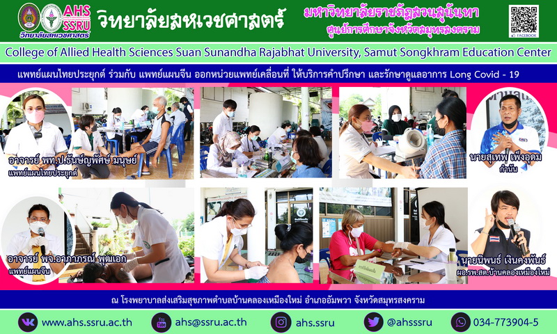 วิทยาลัยสหเวชศาสตร์ นำแพทย์แผนไทยประยุกต์ ร่วมกับ แพทย์แผนจีน ออกหน่วยแพทย์เคลื่อนที่ให้บริการคำปรึกษาและรักษาดูแลอาการ Long Covid - 19 ณ โรงพยาบาลส่งเสริมสุขภาพตำบลบ้านคลองเหมิองใหม่ อำเภออัมพวา จังหวัดสมุทรสงคราม