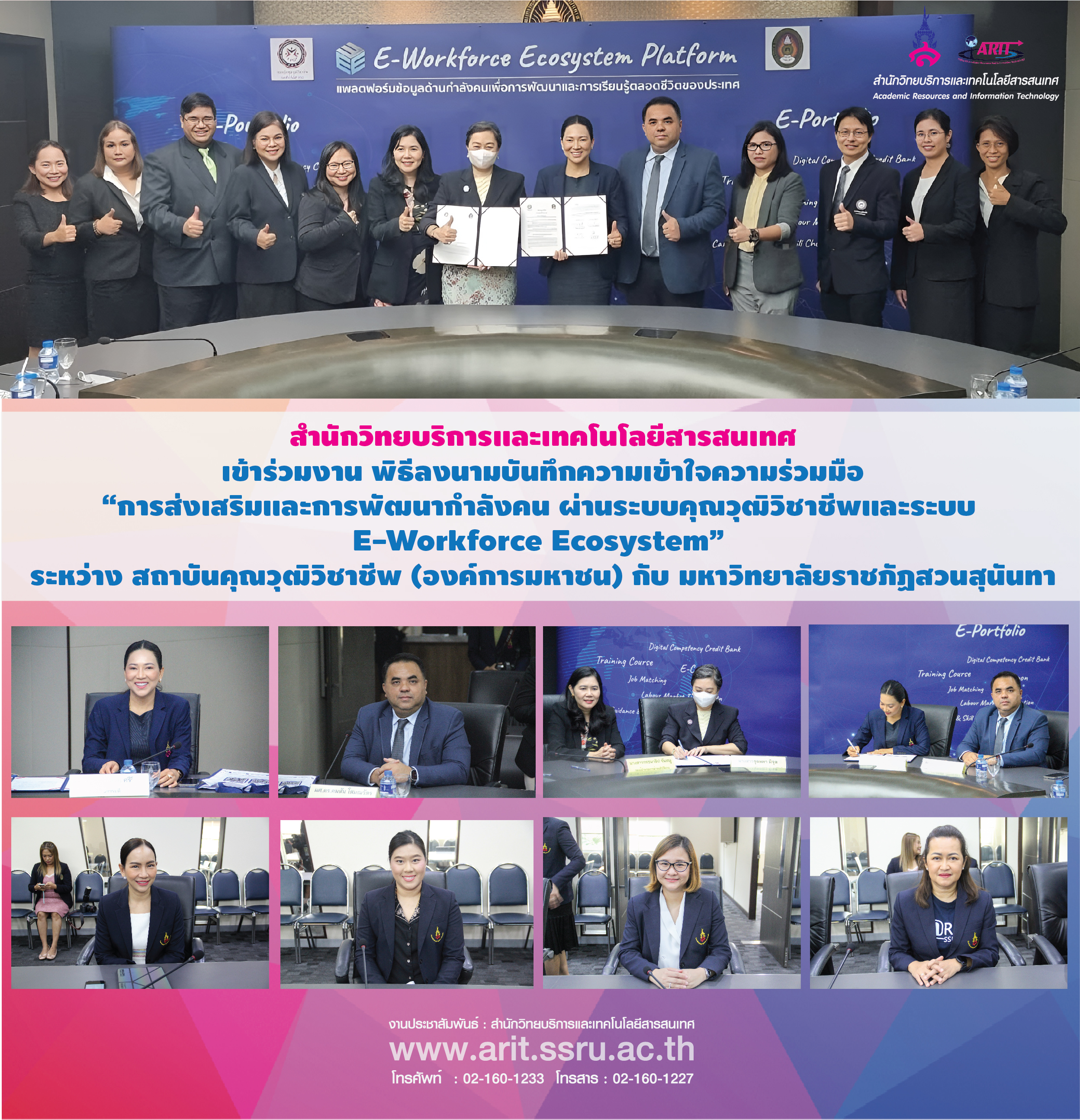 วันที่ 21 สิงหาคม 2566 รองศาสตราจารย์ ดร.ชุติกาญจน์ ศรีวิบูลย์ อธิการบดี ผู้ช่วยศาสตราจารย์ ดร.คมสัน โสมณวัตร รองอธิการบดีวิทยาเขตนครปฐม พร้อมด้วย นางสาวจุลลดา มีจุล รองผู้อำนวยการสถาบันคุณวุฒิวิชาชีพ (รักษาการแทนผู้อำนวยการสถาบันคุณวุฒิวิชาชีพ) นางสาว วรชนาธิป จันทนู รองผู้อำนวยการฝ่ายปฏิบัติการ ได้ทำการลงนามบันทึกความเข้าใจความร่วมมือ “การส่งเสริมและการพัฒนากำลังคนผ่านระบบคุณวุฒิวิชาชีพและระบบ E-Workforce Ecosystem” ระหว่าง สถาบันคุณวุฒิวิชาชีพ (องค์การมหาชน) กับ มหาวิทยาลัยราชภัฏสวนสุนันทา พร้อมร่วมรับฟังการนำเสนอ ระบบ E-Workforce Ecosystem และการเชื่อมโยงสมรรถนะการทำงานและการศึกษาด้วยระบบสะสมผลลัพธ์การเรียนรู้ (Digital Competency Credit Bank) เพื่อการเรียนรู้ตลอดชีวิต และนำไปสู่การลงนามในความร่วมมือระหว่างสถาบัน เพื่อขับเคลื่อนมหาวิทยาลัยสู่การเป็นมหาวิทยาลัยดิจิทัลอย่างเต็มรูปแบบ ณ ห้องประชุมสภามหาวิทยาลัย อาคาร 31 ชั้น 5
