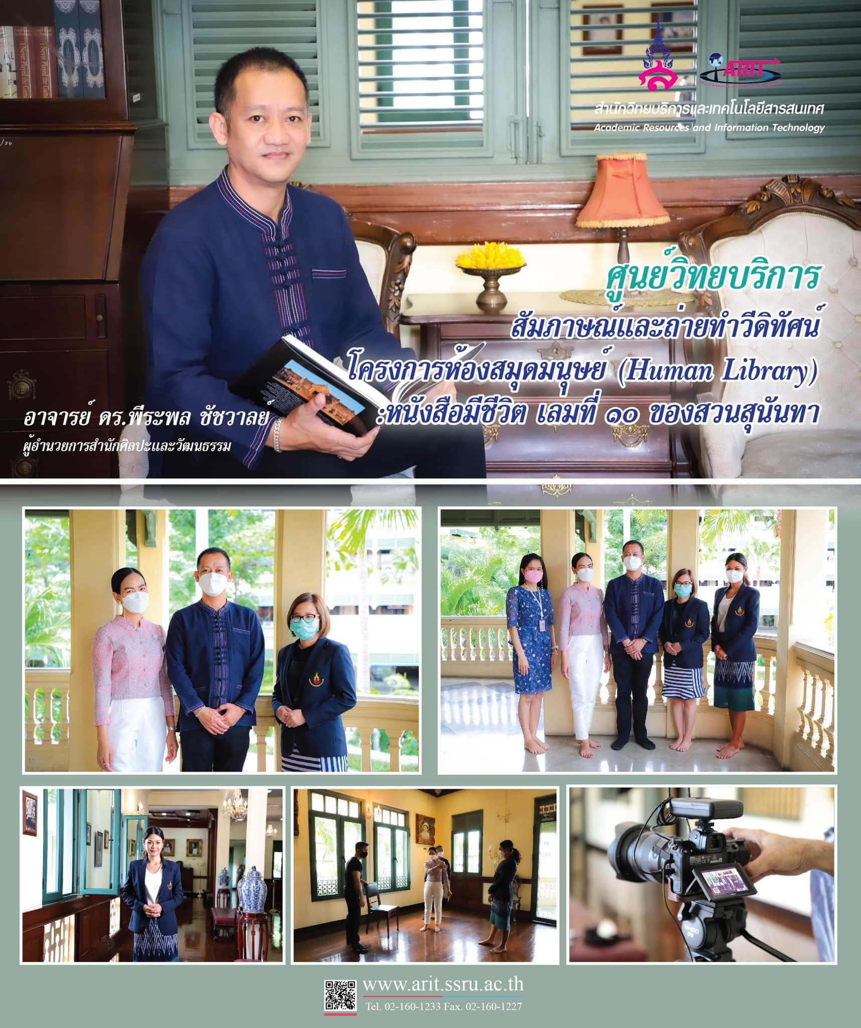 วันที่ 4 สิงหาคม 2564 ศูนย์วิทยบริการ สำนักวิทยบริการและเทคโนโลยีสารสนเทศ นำโดย ผู้ช่วยศาสตราจารย์ ดร.ศิริลักษณ์ เกตุฉาย ผู้อำนวยการสำนักวิทยบริการและเทคโนโลยีสารสนเทศ พร้อมด้วย อาจารย์ ดร.พิมพ์พลอย ธีรสถิตย์ธรรม รองผู้อำนวยการศูนย์วิทยบริการ และบุคลากร เข้าถ่ายทำวีดิทัศน์ อาจารย์ ดร.พีระพล ชัชวาลย์ ผู้อำนวยการสำนักศิลปะและวัฒนธรรม ผู้ทรงคุณค่าและมีความรู้ทางด้านศิลปะและวัฒนธรรมของมหาวิทยาลัยในโครงการห้องสมุดมนุษย์ (Human Library) : หนังสือมีชีวิตเล่มที่ 10 ของสวนสุนันทา