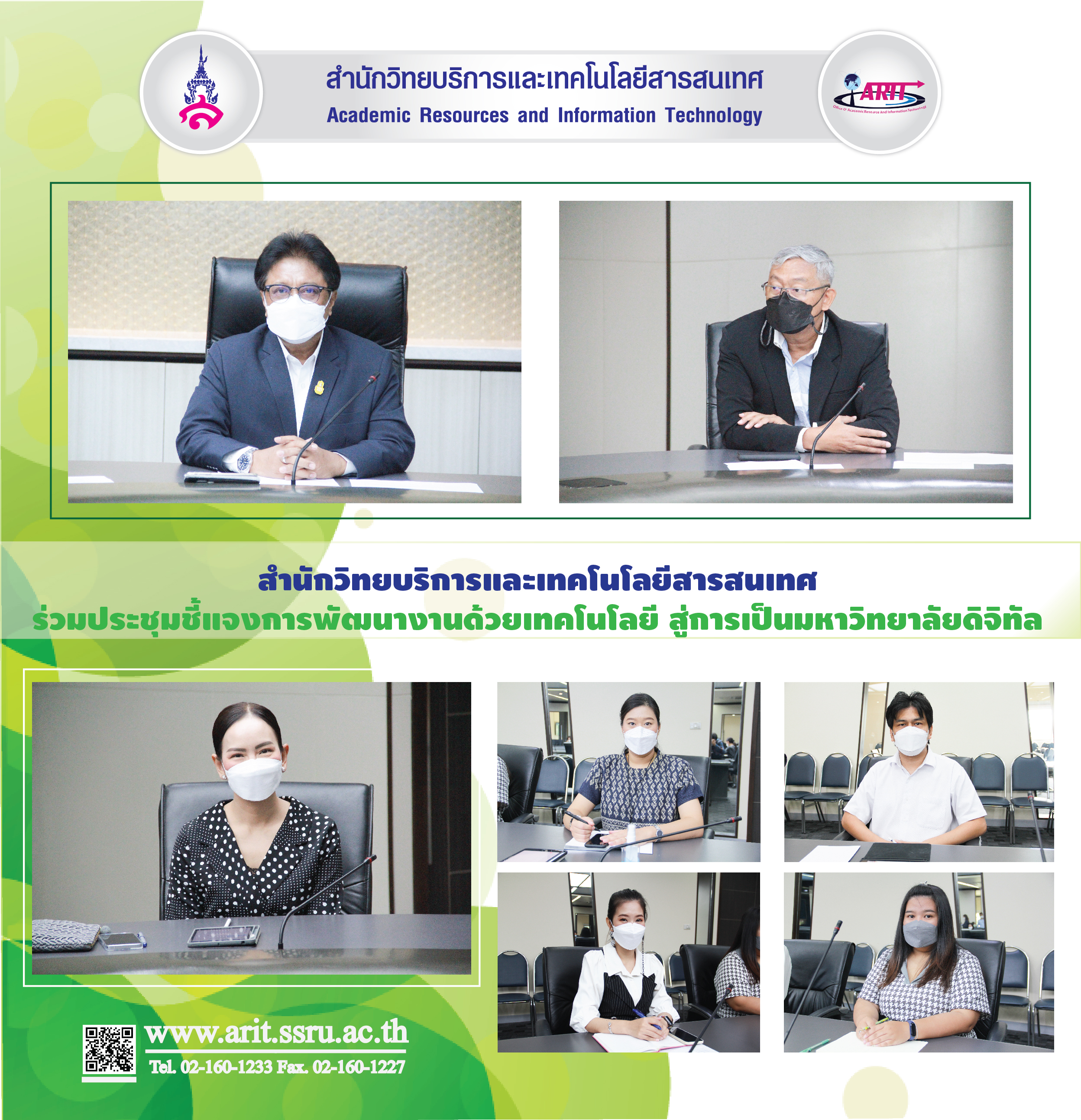 วันที่ 26 พฤษภาคม 2565 สำนักวิทยบริการและเทคโนโลยีสารสนเทศ นำโดย ผู้ช่วยศาสตราจารย์ ดร.ศิริลักษณ์ เกตุฉาย ผู้อำนวยการสำนักวิทยบริการและเทคโนโลยีสารสนเทศ พร้อมด้วย ผู้ช่วยศาสตราจารย์ ดร.กันยพัชร์ ธนกุลวุฒิโรจน์ รองผู้อำนวยการฝ่ายประกันคุณภาพและรายได้ และบุคลากร เข้าประชุมชี้แจงการพัฒนางานด้วยเทคโนโลยี โดยมีผู้ช่วยศาสตราจารย์ ดร.ปรีชา พงษ์เพ็ง รองอธิการบดีฝ่ายบริหาร เป็นประธานในการประชุม พร้อมด้วย รองศาสตราจารย์ ดร.วิทยา เมฆขำ รองอธิการบดีฝ่ายแผนงานและประกันคุณภาพ