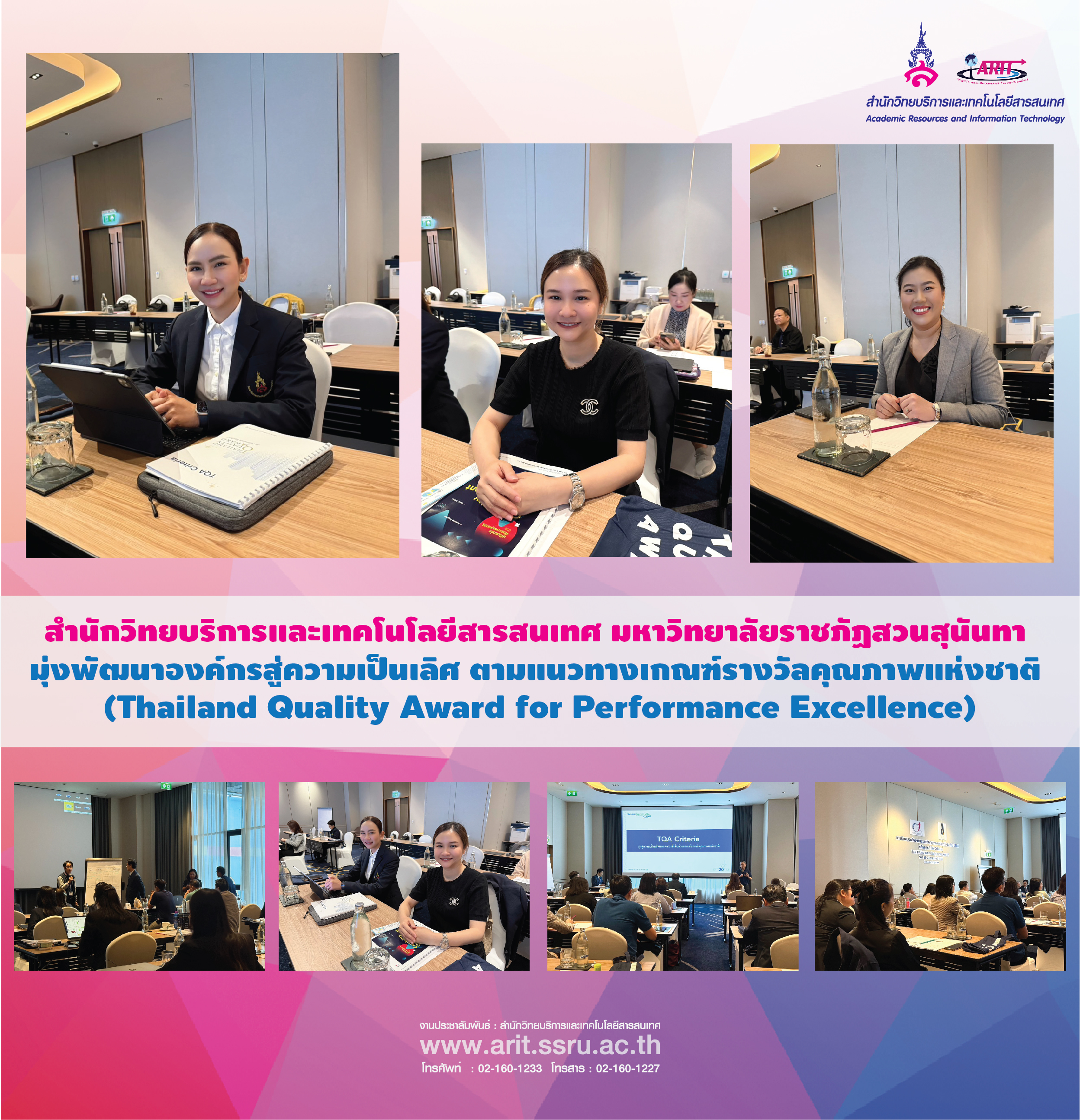 รองศาสตราจารย์ ดร.ศิริลักษณ์ เกตุฉาย รองอธิการบดีฝ่ายเทคโนโลยีดิจิทัล พร้อมด้วย อาจารย์ ดร.พิมพ์พลอย ธีรสถิตย์ธรรม ผู้อำนวยการสำนักวิทยบริการและเทคโนโลยีสารสนเทศ ผู้ช่วยศาสตราจารย์ ดร.กันยพัชร์ ธนกุลวุฒิโรจน์ รองผู้อำนวยการฝ่ายประกันคุณภาพและรายได้ เข้าร่วม การฝึกอบรมการบริหารสู่ความเป็นเลิศตามแนวทางรางวัลคุณภาพแห่งชาติ (TQA Criteria) จัดโดยสำนักงานรางวัลคุณภาพแห่งชาติ