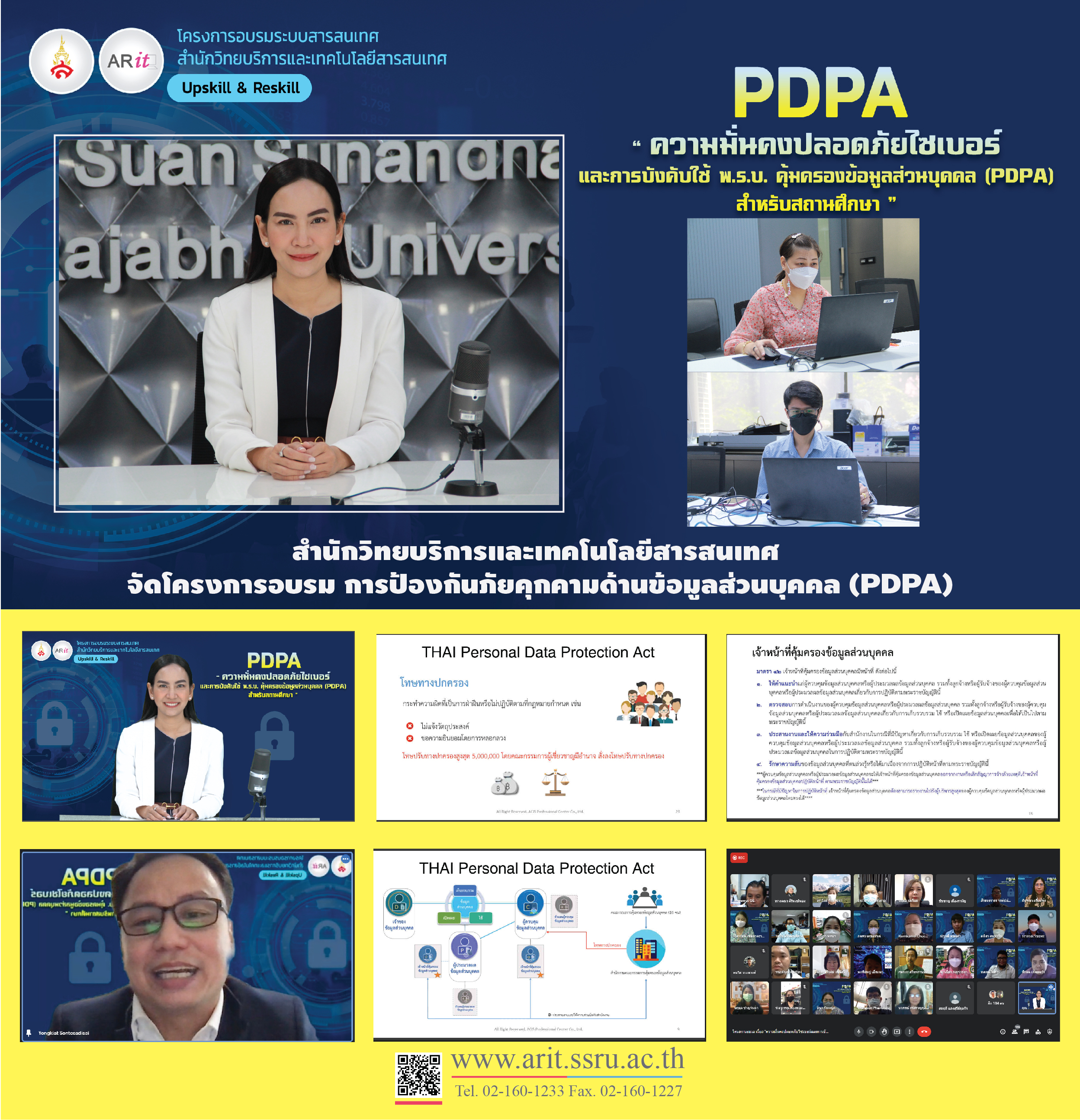 วันที่ 29 มีนาคม 2565 สำนักวิทยบริการและเทคโนโลยีสารสนเทศ โดย ผู้ช่วยศาสตราจารย์ ดร.ศิริลักษณ์ เกตุฉาย ผู้อำนวยการสำนักวิทยบริการและเทคโนโลยีสารสนเทศ เป็นประธานกล่าวเปิดโครงการอบรม "ความมั่นคงปลอดภัยไซเบอร์และการบังคับใช้ พ.ร.บ.คุ้มครองข้อมูลส่วนบุคคล (PDPA) สำหรับสถานศึกษา” และนักวิชาการคอมพิวเตอร์จากหน่วยงานต่างๆของมหาวิทยาลัย โดยได้รับเกียรติจาก คุณยงเกียรติ สนเทศอดิศัย จาก บริษัท ไซเบอร์ตรอน จำกัด และนางสาววัชราลักษณ์ พงษ์ปวเรศ บริษัท เอซิส โปรเฟสชั่นนัล เซ็นเตอร์ จำกัด เป็นวิทยากรในการบรรยาย